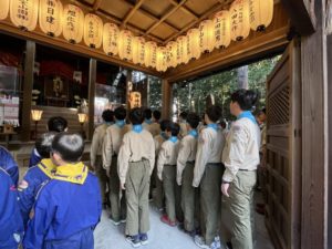 その後は馬路石邊神社へ移動し、参拝を行いました。新年に参拝することで気持ちを整え、今年の活動が無事故で進むよう安全祈願をしました。あわせて、各隊の代表スカウトが新年の抱負を神前で表明した場面も印象的でした。